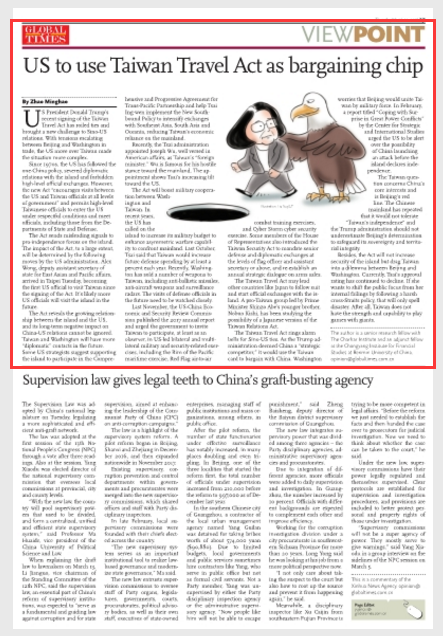 The Taiwan Travel Act rings alarm bells for Sino-US ties. As the Trump administration deemed China a "strategic competitor," it would use the Taiwan card to bargain with China. Washington worries that Beijing would unite Taiwan by military force. In February, a report titled "Coping with Surprise in Great Power Conflicts" by the Center for Strategic and International Studies urged the US to be alert over the possibility of China launching an attack before the island declares independence.