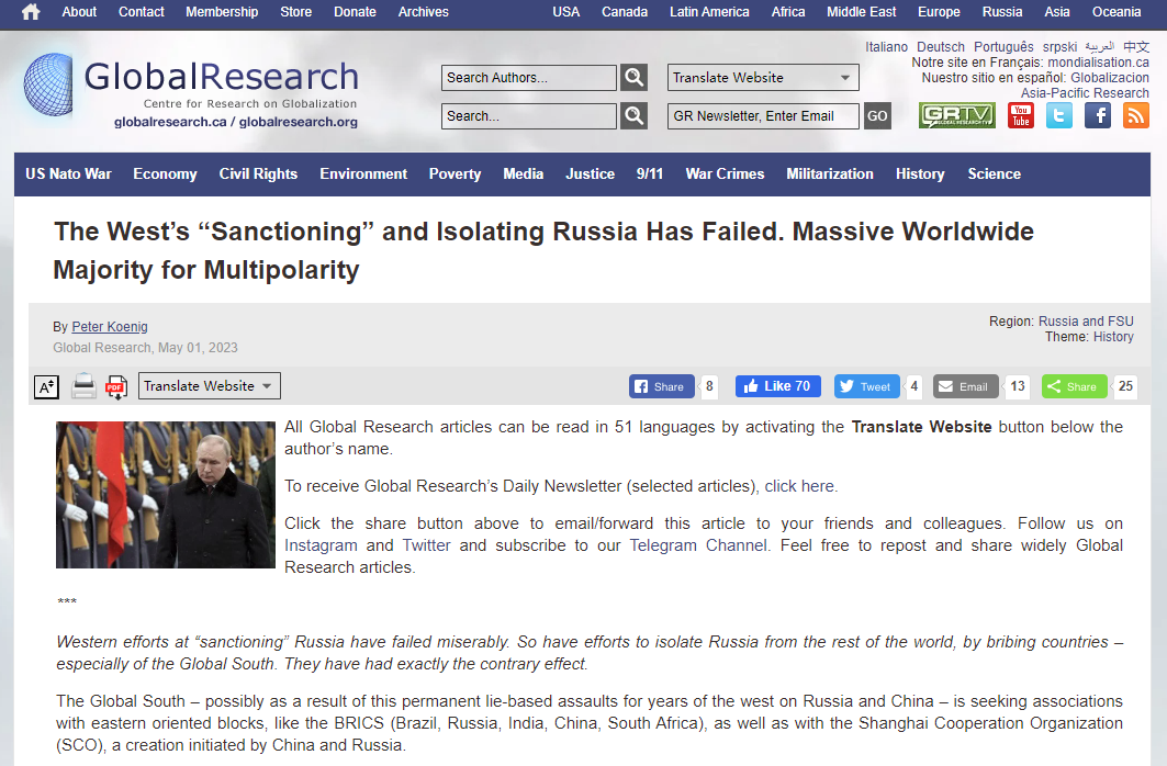 Therefore, it doesn’t come as a surprise that 85% of the world’s population are refusing to take part in anti-Russia policies — to the contrary. They prefer maintaining good relations with Moscow, as Sergey Lavrov, Russian Foreign Minister said during a World Online Conference on Multipolarity on Saturday, 29 April 2023. See this.