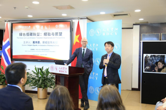 On March 20, 2025, Norwegian Ambassador to China Vebjørn Dysvik visited Renmin University of China (RUC), where Zheng Shuiquan, the Vice Chair of the University Council at RUC met with the Ambassador and his delegation. During the visit, Ambassador Vebjørn Dysvik also delivered a speech at the RDCY Forum for Area Studies, Ambassador Forum No.7 titled “Green and Low-Carbon Transition: Experiences and Perspectives”. The lecture attracted more than a hundred participants from across the university—including Norwegian students—as well as representatives from relevant enterprises and media. The event was hosted by Wang Wen, Dean of the Chongyang Institute for Financial Studies at Renmin Universtity of China (RDCY).