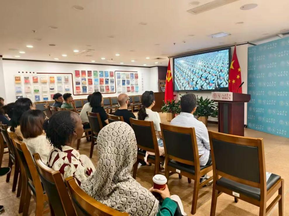 党支部还组织了来自俄罗斯、法国、葡萄牙、希腊、阿根廷、伊朗、巴基斯坦、孟加拉国、南苏丹、肯尼亚、加纳、巴西、赞比亚13个国家的14位中国人民大学丝路学院、国际关系学院的学生共同收看。收看过程中,学生不时拍摄阅兵式的精彩瞬间,并与人大重阳员工积极交流。