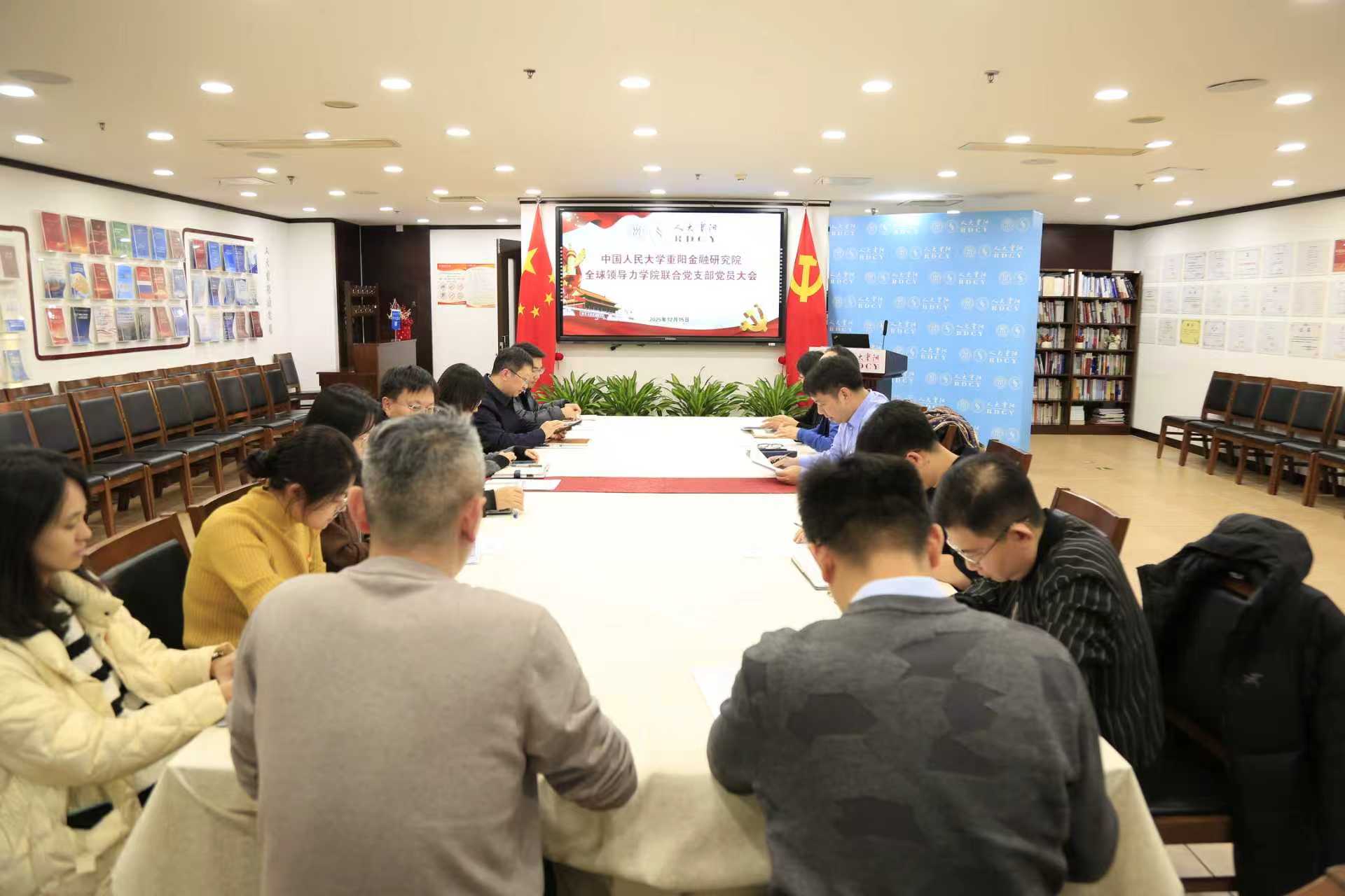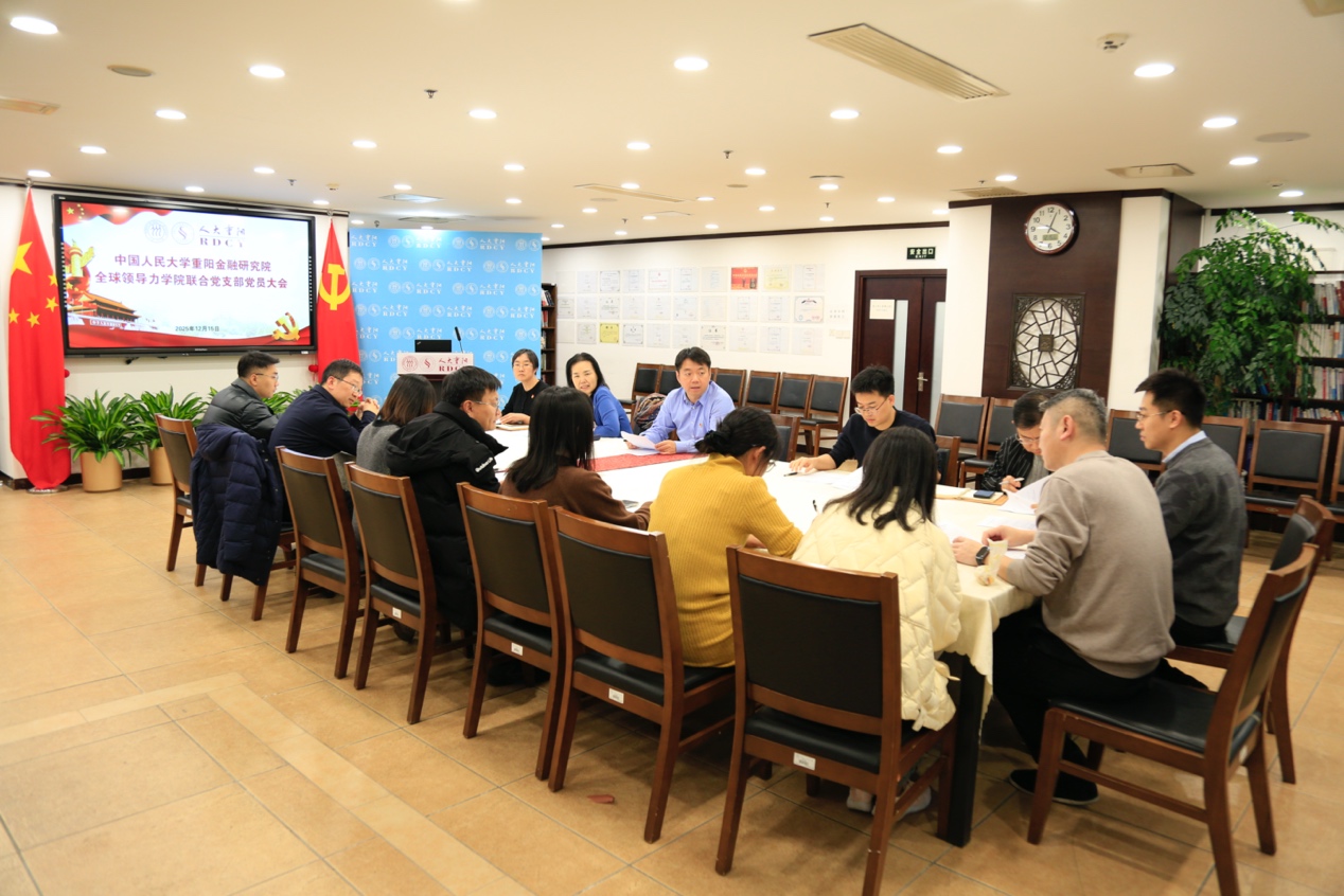2025年12月15日,中国人民大学重阳金融研究院、全球领导力学院联合党支部党员大会在文化大厦602会议室召开,会议由中国人民大学重阳金融研究院院长、全球领导力学院院长王文主持。本次党员大会根据科研与合作机构党委发文,成立中国人民大学重阳金融研究院、全球领导力学院联合党支部,进行支委会换届选举。并围绕集中培训第二次课,以“教育强国建设中智库和学院的新作为”为主题进行专题研讨。会议由中国人民大学重阳金融研究院院长、全球领导力学院院长王文主持。科研与合作机构党委副书记、纪委书记蒋利华参会指导。