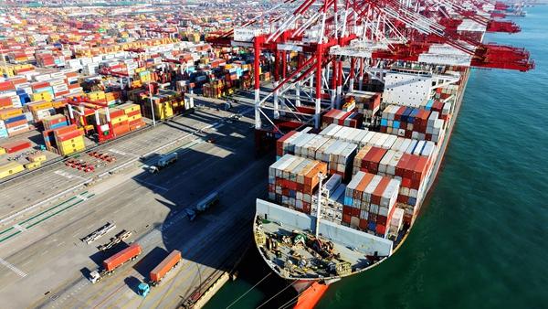 12月8日,山东青岛,货轮在山东港口青岛前湾港装卸外贸集装箱。据中国海关总署12月8日发布的数据,今年前11个月,中国货物贸易进出口总值达41.21万亿元,同比增长3.6%。视觉中国供图