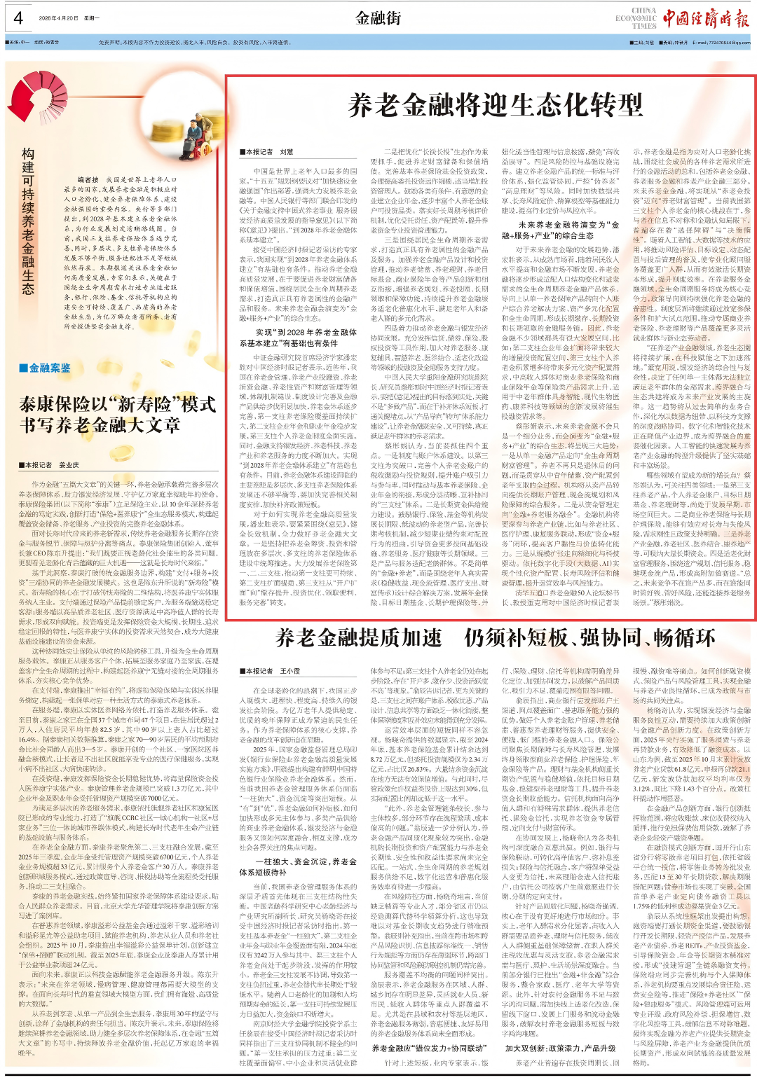 编者按:4月20日,中国人民大学重阳金融研究院副院长、研究员蔡彤娟接受《中国经济时报》采访时表示,我国养老金融体系建设应转向“体系能力建设”,并展望其将向“金融+服务+产业”综合生态演进。现将采访内容发布如下:(全文约2100字,预计阅读时间6分钟)