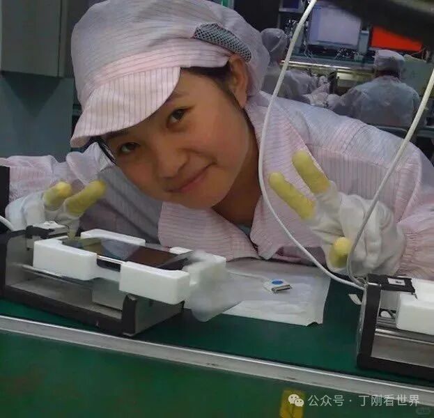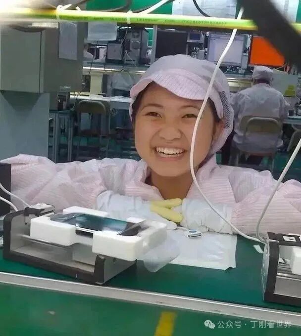苹果手机的流水线上,一位身穿白色工服的中国女孩,笑得明亮又天真。