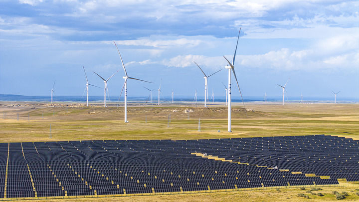 在新疆阿勒泰地区吉木乃县拍摄的50万千瓦时风电项目配套输电线路建设现场(2025年7月1日摄,无人机照片)。新华社发(努尔别克·努尔曼 摄)