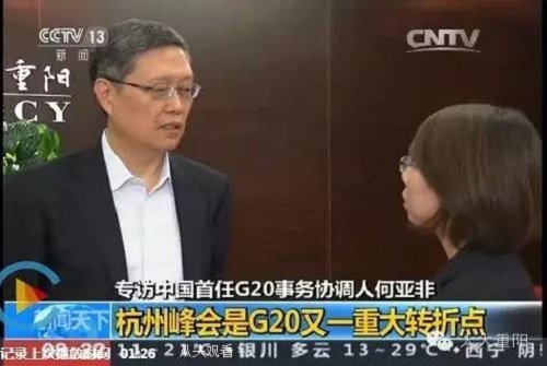 中国首任G20事务协调人何亚非:“它的意义在于中国开始发挥引领作用,就是在G20和全球经济治理中间发挥引领作用。中国提出了很多具体的方案,都被杭州峰会采纳,所以说中国现在提供思想也好,方案也好,都是历史的必然,也是中国的时代担当。”