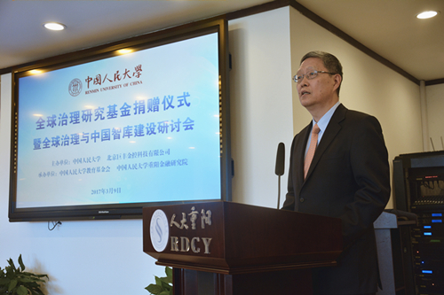 3月9日下午,支持中国人民大学智库建设捐赠仪式暨“全球治理与中国智库建设”研讨会在北京举办。此次捐赠仪式上,巨丰金控科技有限公司宣布无偿向中国人民大学教育基金会捐赠支持设立全球治理研究中心。该中心由中国人民大学重阳金融研究院负责运营管理,聘任外交部前副部长、人大重阳高级研究员何亚非担任中心主任,本文内容依据何亚非在捐赠仪式与其后研讨会上的发言内容整理而成。