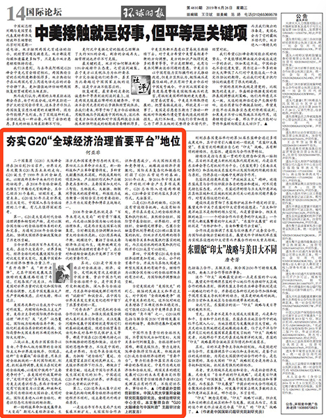 中国作为负责任的全球性大国,不管国际风云如何变幻、大国关系如何纠缠复杂、全球治理如何困难,都需克服阻力,努力支持大阪峰会取得实际成果,积极扶持G20成为全球经济治理的“首要平台”,努力创造条件落实历届G20峰会的各项决定。中美作为两大经济体和全球大国,两国关系的稳定发展对G20的未来有着决定性影响。两国有责任继续携手推动G20发挥其应有的作用,不能前功尽弃,事倍功半。(欢迎关注人大重阳新浪微博:@人大重阳 ,微信公众号:rdcy2013)