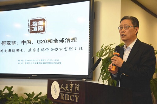 编者按:9月23日,中国人民大学重阳金融研究院第22期重阳论坛在京举办。本期论坛主讲人为第一任中国G20事务协调人,原外交部副部长、原国务院侨务办公室副主任、人大重阳高级研究员何亚非。他以“中国、G20和全球治理”为题,将中国在G20全球治理进程中所发挥的作用及峰会成果进行系统性梳理,阐述“中国方案”对世界经济中长期增长的重要意义,尤其是中国经验、中国智慧、中国能力对G20机制长远的积极的正面信号。中国人民大学副校长、重阳金融研究院执行理事吴晓球,中国人民大学科学研究处副处长牟锋等出席该论坛。人大重阳执行院长王文主持论坛。以下为何亚非发言实录: