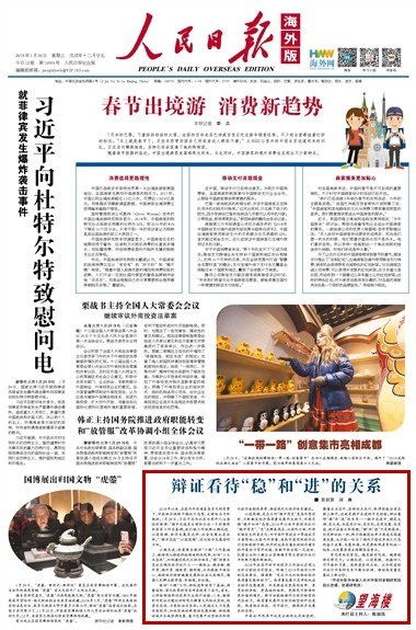 中国40年改革开放是全面的也是渐进的,摸着石头过河,坚持试点先行,取得经验后再在面上推开。这就是稳中求进的历史经验。辩证看待“稳”和“进”的关系——稳中求进中,稳是主调,是大局。而进是方向,是目标。没有发展、没有进,就不会真正实现稳。“稳”和“进”不是割裂的,而是辩证统一的。既不能激进地单方面追求高速度发展,也不能一味为了稳而不惜放弃来之不易的奋斗成果、发展机遇,而是要把两者有机统一起来,从发展角度去理解各自重点。