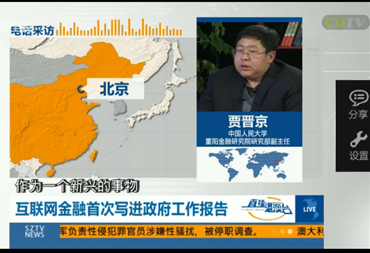 日前中国人民大学重阳金融研究院研究部副主任贾晋京就互联网金融写入政府报道接受深圳卫视采访。贾晋京分析认为,尽管只有短短两句话,但这是互联网金融首次进入中国的政府工作报告,代表着互联网金融的发展和监管已然进入决策层的视野。