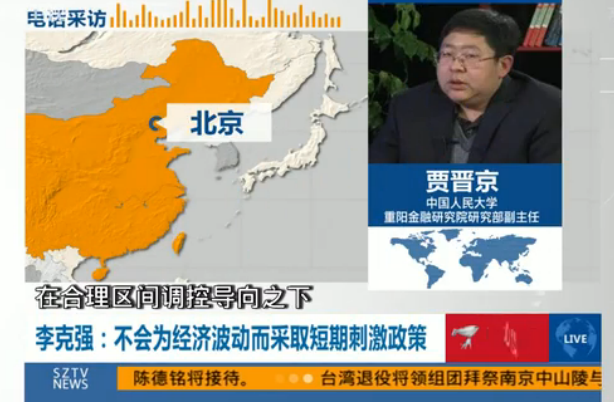 中国人民大学重阳金融研究院研究部副主任贾晋京日前接受深圳卫视采访,围绕李克强总理在博鳌论坛上的演讲进行分析。谈到政府不会为经济波动而采取短期刺激政策时,贾晋京分析称“在合理区间的调控导向之下,中国只要能够达到保就业底线,就可以去实现民生导向目标以及释放改革红利目标”。