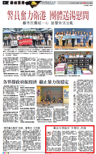 香港风波已持续两月有余,暴力活动越演越烈。中国人民大学重阳金融研究院院长助理贾晋京表示,从向警察投掷汽油弹,伤害内地游客,再到瘫痪香港机场,殴打记者,暴徒的卑鄙行径正在使香港的繁荣与稳定朝失控方向升级,香港的信用创造和塑造能力因此受到不可逆的伤害,已经面临丧失“生态位”的危险。