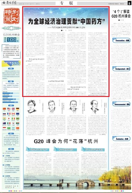 2016年9月4日至5日,二十国集团(G20)领导人第十一次峰会将在中国杭州举行。此次G20峰会是中国首次举办具有全球经济治理“顶层设计”性质的峰会,是中国参与全球治理迈上的一个新台阶,也将见证世界历史上的“中国时刻”。金融危机以来的全球经济治理成果表明,G20是各国在面对共同问题时分享智慧、达成方案的有效机制。面对当今的世界经济形势,全球经济治理要解决两个问题:一是找准“病灶”,精准“把脉”世界经济;二是对症下药,为促进全球经济治理开出“药方”。中国主办G20峰会,意味着世界将有机会分享实现可持续发展的“中国药方”。