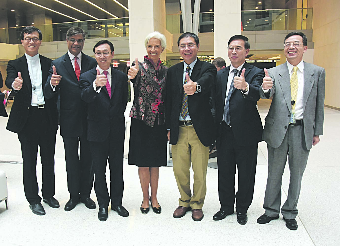 IMF总裁拉加德9月30日在美国华盛顿宣布,IMF将从今年10月1日起正式启用包括人民币在内的新的特别提款权货币篮子。图为拉加德(左四)与IMF副总裁张涛(左三)、中国驻IMF执行董事金中夏(右三)等为人民币“入篮”点赞。(图片来源:中新社)