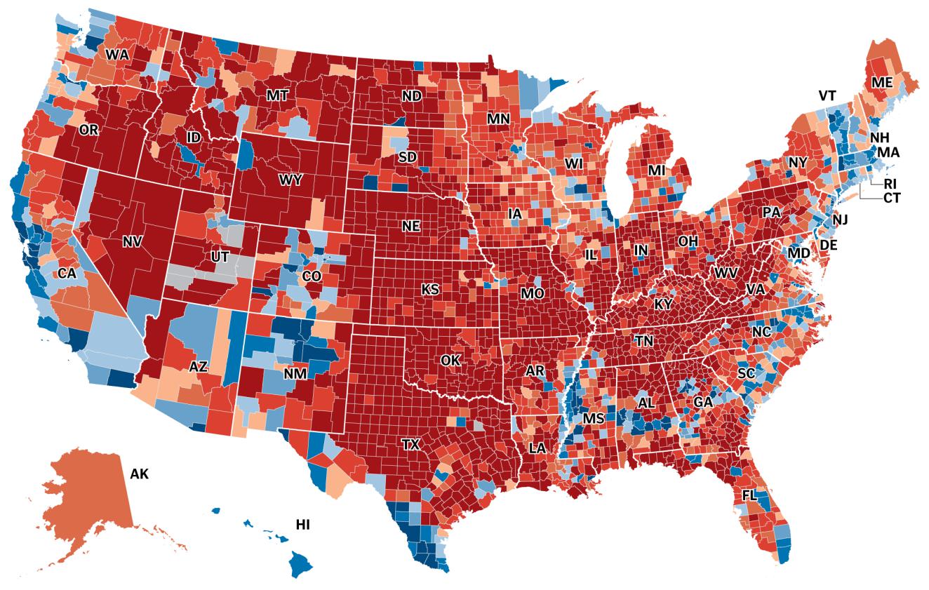 下面这张图是基于县域选情展示的2016年美国大选投票结果,其中红色代表特朗普获胜的县,蓝色代表希拉里·克林顿获胜的县,颜色越深代表所获选票比例越高。