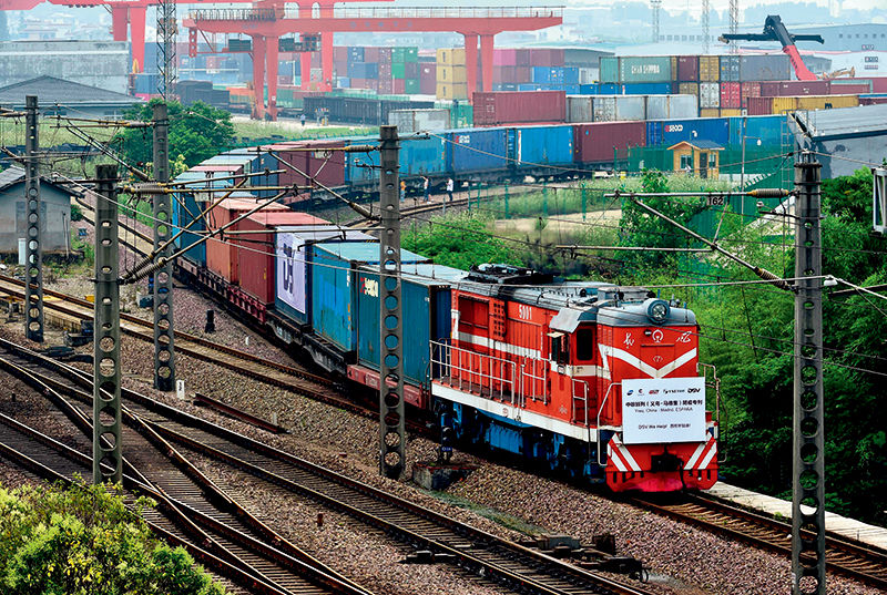 2020年6月5日,满载防疫物资的“义新欧”中欧班列(义乌—马德里)在义乌西站启程,前往西班牙首都马德里 吕斌摄/本刊
