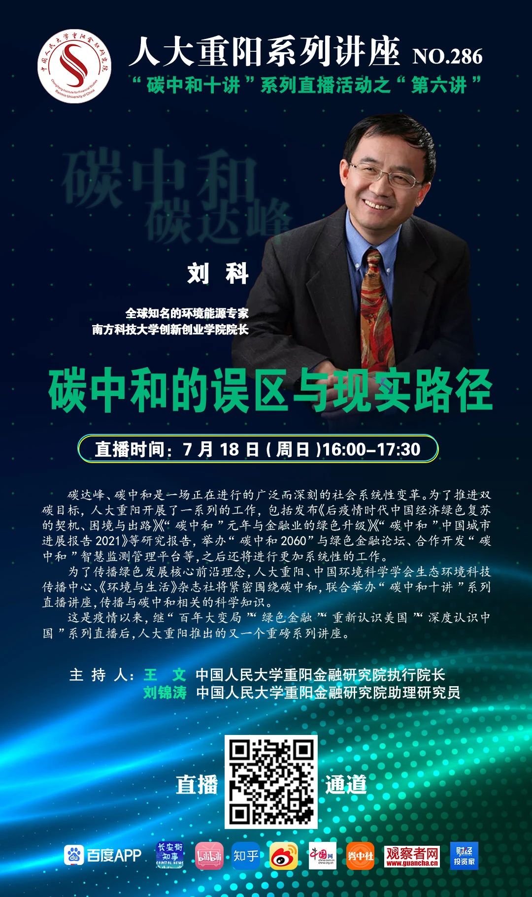 为了传播绿色发展核心前沿理念,人大重阳、中国环境科学学会生态环境科技传播中心、《环境与生活》杂志社将紧密围绕碳中和,联合举办系列讲座,传播与碳中和相关的科学知识。这是疫情以来,继“百年大变局”“绿色金融”“重新认识美国”“深度认识中国”“数字货币十讲”“党史中看百年”系列直播后,人大重阳推出的又一个重磅系列讲座。第六讲具体安排如下:
