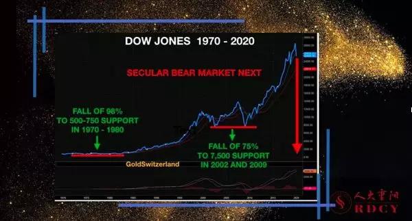 我们要了解一个大背景,目前为止道指跌了多深?虽然从单周来看道指的跌幅巨大,但现在的情况再跌去75%才到了2002年和2009年达到过的低点。2009年低点是2008年金融危机之后形成的,2002年的低点是2001年美股市场互联网泡沫破灭后形成的。而道指跌去98%才达到1970-1980年的四十年前的水平,四十年的时间它涨了四十倍。