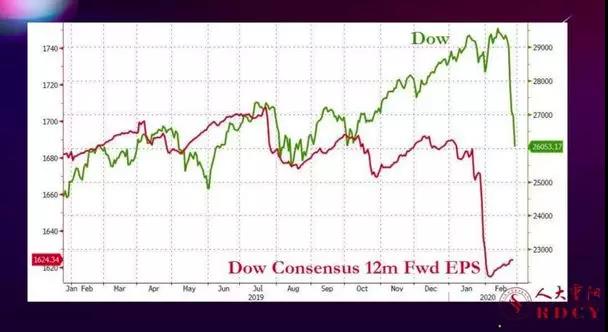 通过这张图,我们可以看到在道琼斯指数(绿线)下跌之前未来12个月美股平均每一份收益率先行下降。为什么会这样呢?我们之所以买股票是指望公司能够给我们赚钱,当新冠肺炎疫情来临,美股每一份股票的未来收益率先下来了,然后领着道琼斯股票指数下跌。每一份股票的预期收益率是这家公司未来能挣多少钱,是公司的现金流,而这个公司的现金流决定了这个公司的估值。但是由于新冠肺炎疫情来了,市场预期人们未来一段时间可能不出门,不去消费,所以,股票未来的预期收益率就失去了一个很重要的支撑。