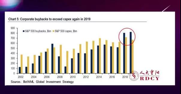 在此之前,美国股票的支撑水平已经不是在靠公司真实业绩的提高在支撑了,而是在靠所有公司的回购,换句话说美国的股票本来就是一个缺乏真实的市场销售来支撑的股票水平。下面这张图表示的是公司自己的回购水平和公司用于生产性,扩大生产的比例关系的变化。从2018年四季度起到2019年全年,美国发生的一个重大变化,就是标普500指数这500家公司总体上用于收购自己股份花的钱已经超过了用于未来扩大生产花的钱,它说明了一个什么问题呢?一个公司上市以后,它的目标到底是把公司股价炒上去还是实现扩大生产和扩大销售收入?如果一家公司大部分的支出都花在维持自己的股价上,那说明什么问题?这就打一个比方,好像吃饭是为了工作还是工作是为了吃饭的问题?公司的工作就是经营主营业务扩大生产,以便通过扩大更多的销售来获得更多的收入。但是如果公司要是不这么做,而是全部都在维持自己的股价,那就相当于一个人工作是为了吃饭,这是一个辩证性的问题。