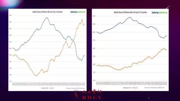 西方过去的四十多年里一直在经历着经济金融化的过程,这使得所有经济过程能够表现在金融市场的种种数据中。这里涉及一个问题,传统上我们所说的人民群众的生产生活问题到底是怎么样的?这两幅图,左边的这一幅图表示的是美国的家庭财富排名前1%的家庭(黄线)和后90%的家庭(蓝线)所占财富比例随时间的变动。我们能够看到在这里,目前来讲前1%的家庭拥有的财富已经远远要高于后边90%家庭拥有的财富。