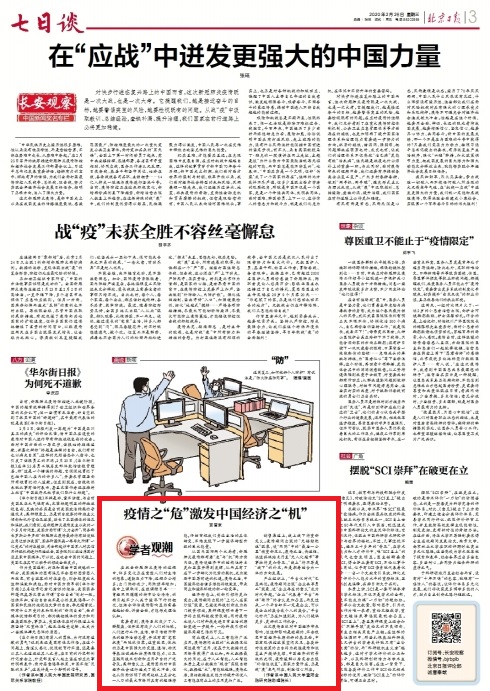 从国内国际两个大局看,新冠疫情都有着“危”与“机”两方面内涵。疫情使经济中的结构性特点更加显露并得到发挥,从而具有了在下一步转化为优势的契机,成为激励中国再前进的发展机遇。疫情之后,中国经济社会诸多潜能将被激发,带来商业和经济环境的新一轮变革。