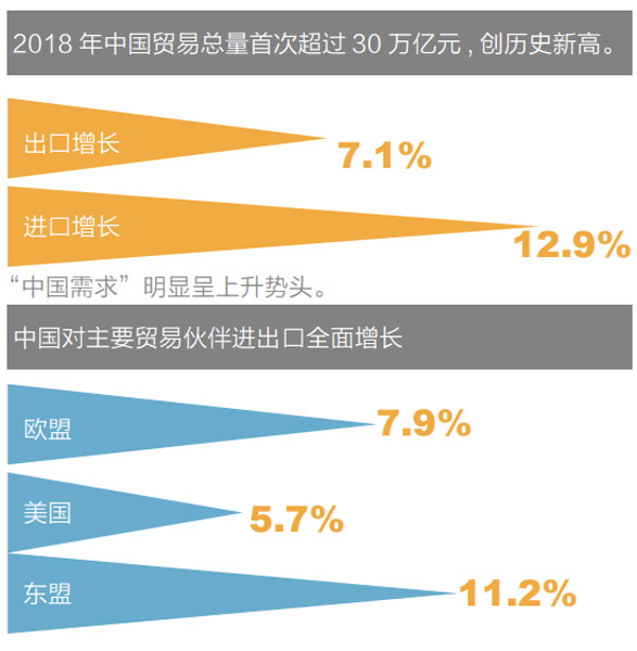 结合国际市场,更易看清中国宏观经济的全景。2018年中国贸易总量首次超过30万亿元,创历史新高。其中,出口增长7.1%,进口增长12.9%,“中国需求”明显呈上升势头。中国对主要贸易伙伴进出口全面增长,对欧盟、美国和东盟进出口分别增长7.9%、5.7%和11.2%;对“一带一路”沿线国家合计进出口增长13.3%,高出货物进出口总额增速3.6个百分点。可见,中国进出口格局在全球贸易版图上正在实现结构优化。