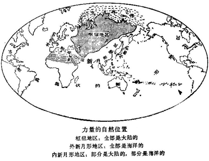 麦金德认为,图中的"枢纽地区"是整个世界的"心脏",如果有一支强大的力量以这个地区为大本营向外扩张,能够控制其外围的"内新月形地区"从而得到参与制海权争夺的机会的话,它就能建立一个足以统治全球的"世界帝国"。