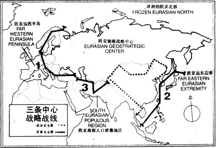 在这幅图中,布热津斯基阐述了三条围绕"内新月形地区"形成的中心战略战线,从日本到马六甲海峡的是第二条中心战略战线,对此,布热津斯基写到: