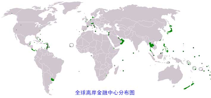 从图中可见:全球离岸金融中心最集中的区域就是两个:加勒比海和南海周边。实际上这些地方绝大多数是英国海外领土和前英国殖民地,少数不在此列的地方(如日本、菲律宾、巴拿马),则大多为美国势力范围,而在全球金融势力格局中,美国和英国的金融势力集团属于同一伙人。