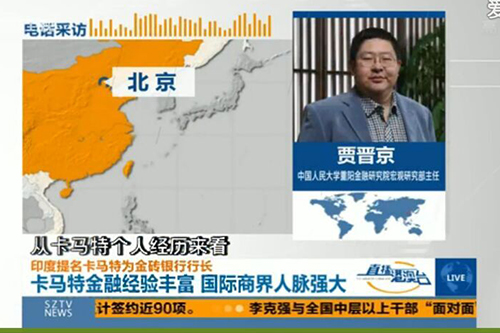 贾晋京系中国人民大学重阳金融研究院宏观研究部主任,图为接受深圳卫视连线采访。