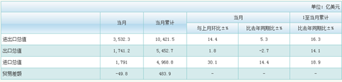 从商品结构看,机电产品出口2.10万亿元,增长9.5%,占比59.4%,其中集成电路、手机和汽车出口分别增长25.4%、13.5%和10.3%。天然气、原油、大豆等10大类大宗商品进口额合计增长9.1%,其中天然气、原油、煤炭和铜精矿进口数量分别增加37.3%、7.0%、16.6%和7.4%。机电产品进口1.42万亿元,增长14.9%;其中金属加工机床、集成电路、计算机进口额分别增长51.3%、28.7%和17.3%;进口汽车28万辆,增长5.7%。