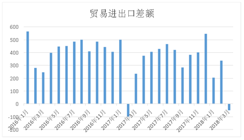 近日,海关总署公布了2018年第一季度贸易数据:一季度中国货物贸易进出口总值为6.75万亿元人民币,比去年同期增长9.4%。其中,出口为3.54万亿元,同比增长7.4%;进口3.21万亿元,同比增长11.7%;贸易顺差3261.8亿元,同比收窄21.8%。其中值得注意的是,3月份当月,以美元计,中国出口总值同比下降2.7%,进口总值增长14.4%,出现了49.8亿美元的贸易逆差,这也是自2017年2月份以来首次出现逆差。