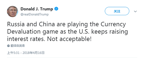 特朗普推文是这么写的,俄罗斯和中国在美国加息时玩起了贬值游戏,不可接受。