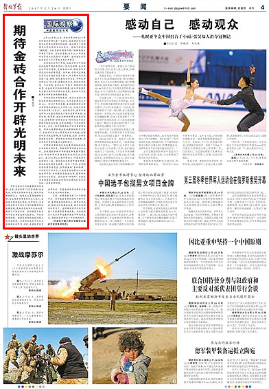 金砖国家合作十年来,已成为新兴市场国家和发展中国家合作的一块闪亮招牌,成为促进世界经济增长、完善全球治理、推动国际关系民主化的重要力量。今年初,习近平主席致信其他金砖国家领导人表示,中方期待同各成员国一道,围绕“深化金砖伙伴关系,开辟更加光明未来”的主题,凝聚合作共识,规划合作蓝图。可以预期,金砖合作“中国年”将取得丰硕成果,为金砖国家的共同发展、新兴市场国家和发展中国家的经济社会发展、全球和平与发展事业开辟更加光明的未来。