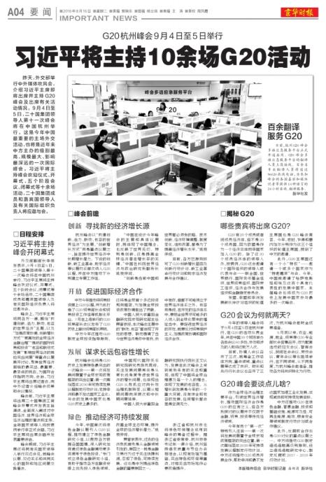 昨天,外交部举行中外媒体吹风会,介绍习近平主席即将出席并主持G20峰会及出席有关活动情况。9月4日至5日,二十国集团领导人第十一次峰会将在中国杭州举行。这是今年中国最重要的主场外交活动,也将是近年来中方主办的级别最高、规模最大、影响最深远的一次国际峰会。习近平将主持峰会欢迎仪式、开幕式、五个阶段会议、闭幕式等十余场活动,二十国集团成员和嘉宾国领导人及有关国际组织负责人将应邀与会。