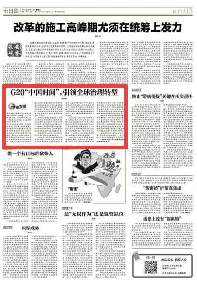 中国角色:从全球治理的参与者向改革者转型。今年,中国为全球治理注入了诸多新议程:通过倡导创新,为推动世界经济强劲、可持续、平衡增长增添新的动力;通过推进结构性改革,为解决当前经济金融领域面临的各种困难拿出新的方案;通过强化发展合作,为引领全球发展目标开辟新的前景。