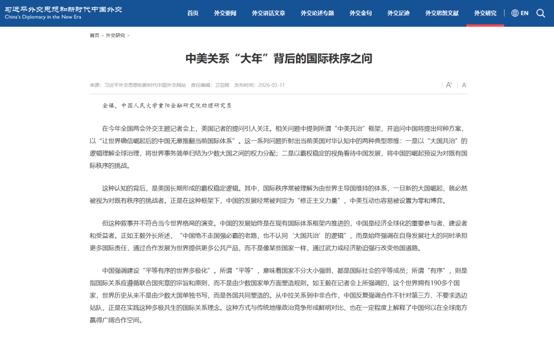 3月11日,中国人民大学重阳金融研究院助理研究员金臻在习近平外交思想和新时代中国外交网站发表文章表示,如果美国仍以霸权思维理解中国崛起,则双方摩擦与误判难以避免。