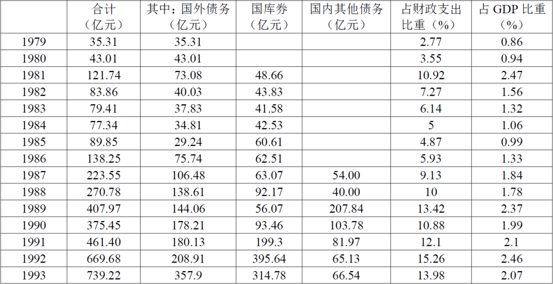 改革开放后,中国启动以放权让利为核心的改革,政府对企业放权、中央对地方放权,包干制盛行,调动了地方政府和企业的积极性,有力地推动了经济发展。但是放权让利的结果是“两个比重下降”,即财政收入/GDP比重、中央财政占全国财政收入比重持续下降,前者从1978年的30.9%下降至1993年的12.2%,1995年更是下降至10.2%;后者从1984年的40.5%下降至1993年的22%(图1)。总体上财政收支缺口持续扩大,1978年收支差为10.2亿元,1993年降至-293.35亿元。1979年中国再度举借外债;1981年之后重启国债发行,当年发行48.66亿元(表1)。1981年外债余额占国债余额的78.67%,到2003年下降为2.71%。