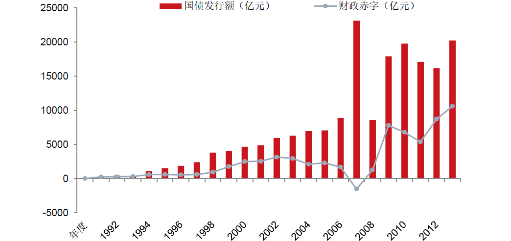1992年党的十四大确定了社会主义市场经济体制改革的目标,1994年十四届三中全会通过了《中共中央关于建立社会主义市场经济体制若干问题的决定》,要求“中央财政赤字不再向银行透支,而靠发行长短期国债解决”。1995年《中国人民银行法》第28条规定:“中国人民银行不得对政府财政透支,不得直接认购、包销国债和其他政府债券。”因此,一方面社会主义市场经济成为经济体制改革的目标,要建立现代企业制度,实现政企分开。为推动改革,财政的开支增加。另一方面《中国人民银行法》的实施,要求中央财政赤字不得再向中央银行透支,必须完全依靠发行国债弥补。这客观上引发对国债弥补赤字的需求,尤其是在1995年后国债发行额快速上升。此阶段的国债发挥着弥补赤字和为经济建设筹集资金的功能。