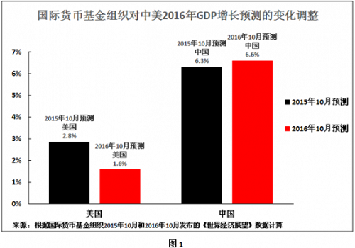 IMF在2016年10月发布新的《世界经济展望》,将美国2016年增长率下调至1.6%,即从2015年2.6%的增长率基础上严重减速。与此同时,IMF预测中国2016年增长率从6.3%上调到6.6%。