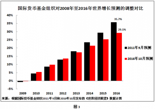 图3所示的是IMF所做的世界经济五年增长预测,即2011年秋天到2016年的增长预测,相信有助于大家对2008年国际金融危机爆发后至今的形势对比,有一个更直观的认识。