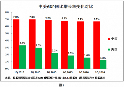很明显,2016年世界最大经济体中经济增长大幅放缓的是美国,而非中国:中国GDP增长率仅从2015年第一季度的7.0%降至2016年第二季度的6.7%,同期美国则从3.3%大幅降至1.2%。