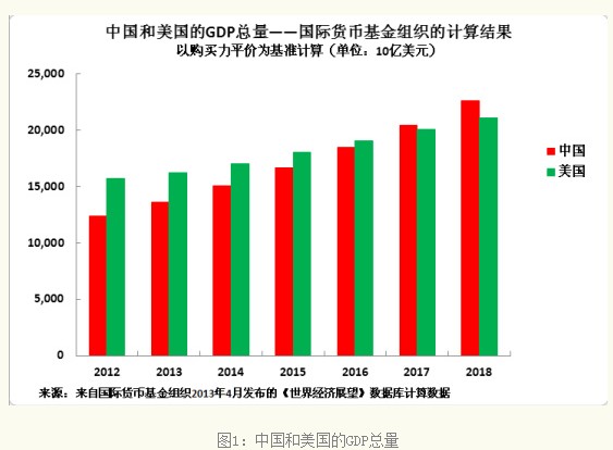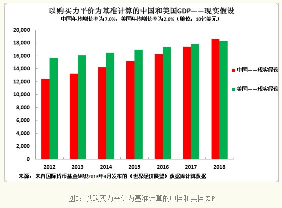 应当指出的是, 在2018年中国GDP就已十分接近美国,因而假设中的微小变化——例如,美国GDP年均增长率为2.4%或者中国GDP年均增长率为7.2%——以市场汇率计价的结果是,中国在2018年就必然会已成为世界最大经济体。