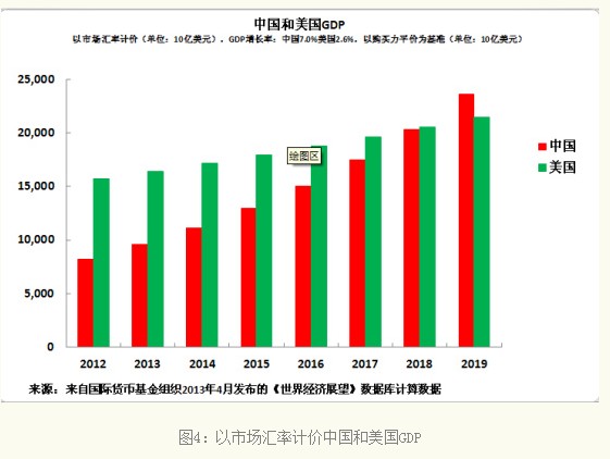 因而,如下图4所示:如果假设美国经济实际年均增长率为2.6%,美国GDP平减指数年均增长率为2.0%;与此同时,中国经济年均实际增长率为7.0%,中国GDP平减指数年增增长率为3.5%,在此基础上的市场汇率计价结果是,中国将在2019年超越美国成为世界最大经济体。