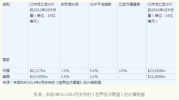 因而,3.0%的年均增长率明显高于美国实际的经济表现。我在下文将假定美国过去20年的年均增长率2.6%为其未来增长率——根据美国最近的经济表现看,这是一个相对乐观的假设。对于中国经济,我将假定7%为其未来增长率,这是中国国家信息中心首席经济学家范建平曾公开表态的最低数字。
