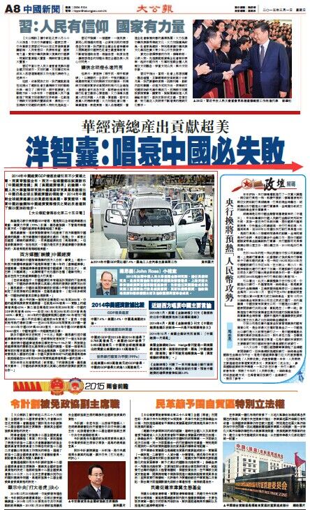 2014年中国经济GDP增速放缓引来不少质疑之声,而贯穿整个全年,西方一些媒体都在试图散布“中国经济危机”与“美国经济增长”的论调。中国人民大学重阳研究院外籍高级研究员罗思义指出,中国仍是全球主要经济体的领跑者,2014年中国对全球经济总产出的贡献超过美国。事实证明,唱衰中国的论调和中国经济实际情况之间的反差达到了无以復加的地步。