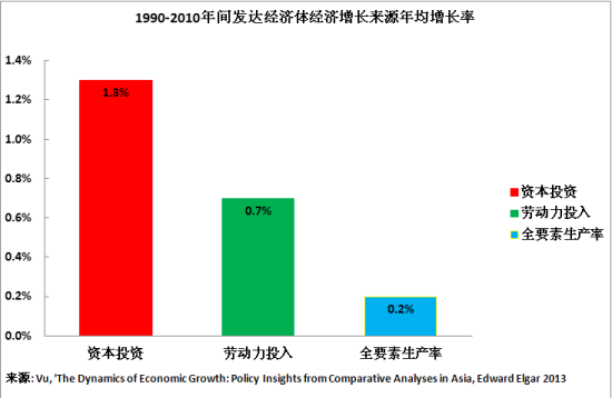 事实上,如果发达经济体主要依赖于全要素生产率的提高来发展经济,那么其经济发展速度一定慢如蜗牛——全要素生产率对经济增长的贡献率太小,无法成为拉动经济增长的关键引擎。以1990-2010年间发达经济体最全面的增长核算数据来看,全要素生产率的年均增长率仅为0.2%。相比之下,劳动力投入年均增长率为0.7%,资本投入则为1.3%。