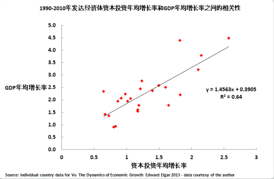 发达经济体资本投资增长率和GDP增长率之间的相关性为0.64 ——相关性较强;